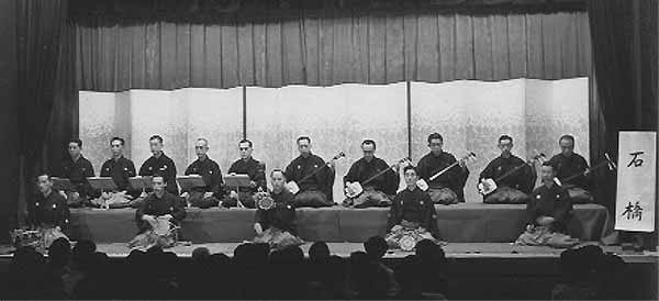 撮影年月不詳 長唄会での舞台写真。 下段左から(太鼓:望月彦次郎さん)(大鼓:望月太意蔵さん)(立鼓:初代望月太明藏) (小鼓:初代望月太明十郎のちの2代目太明藏)(笛:藤舎秀江)